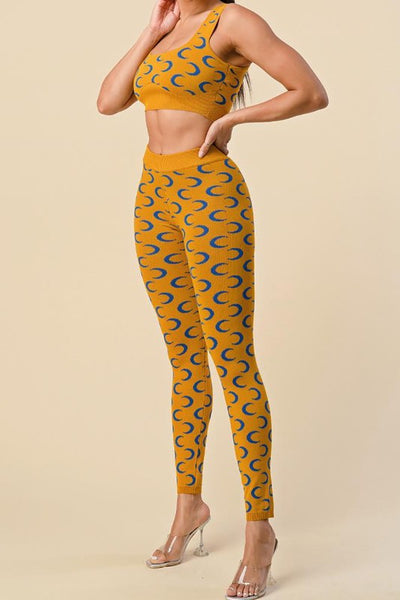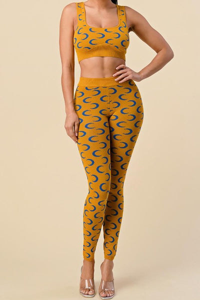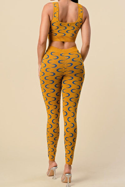 YELLOW, MUSTARD TWO PIECE MOON PRINTED SET. SLEEVELESS CROP TOP W/ MATCHING PANTSGREAT STRETCHCOTTON 60% RAYON 40%