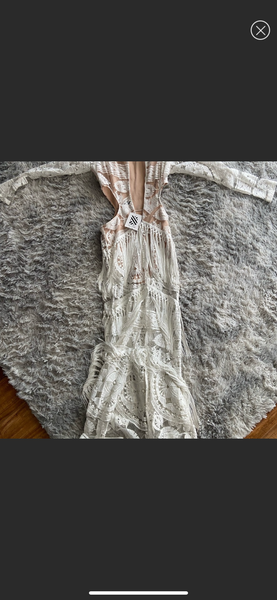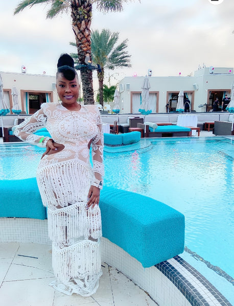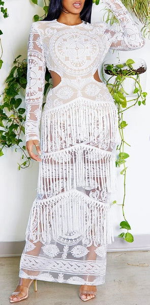 This gorgeous Fringed Maxi Dress wraps you in luxuriousness with its lacing and lining, not to mention shoulder pads and side slits. A zippered back closure keeps things smooth, all while a 100% polyester construction ensures an exact fit. For best results, hang dry only.
