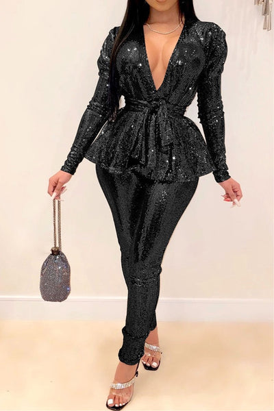 Shine like a star in our Disco Queen pants suit. Covered in sparkling sequins, this 2 piece set features a wrapped, tied top with long sleeves and a flattering V neck. The perfect outfit for stealing the spotlight and making a statement.