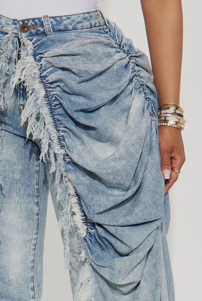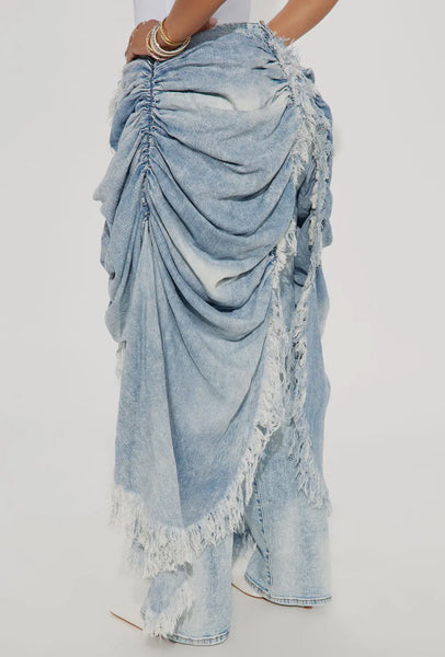 distressed jeans for women, denim overlay pants, skirt overlay jeans, trendy women’s jeans, fashion boutique denim, statement denim pants, unique jeans for women, street style jeans, high-fashion denim, ruffled overlay jeans
