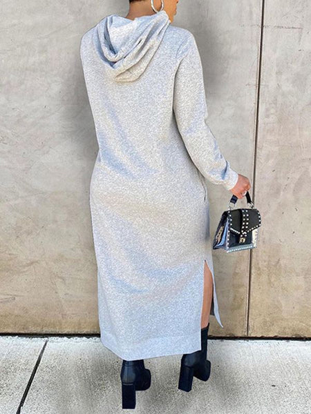 Cozy Hoodie Dress with side slit! Comes with The softest jersey fabric, a polyester blend & a hoodie & drawstring, for long-sleeved lounging or daily wearin'.Maxi-dress madness!