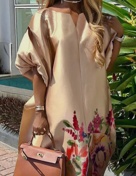 Indulge in the epitome of sophistication with our Half Sleeve Floral Maxi Dress, boasting a sleek split-front and a delicate V-neck that enhances every shape. The luxurious satin-like sheen and striking floral design truly make this dress a one-of-a-kind masterpiece, perfect for any upscale occasion.