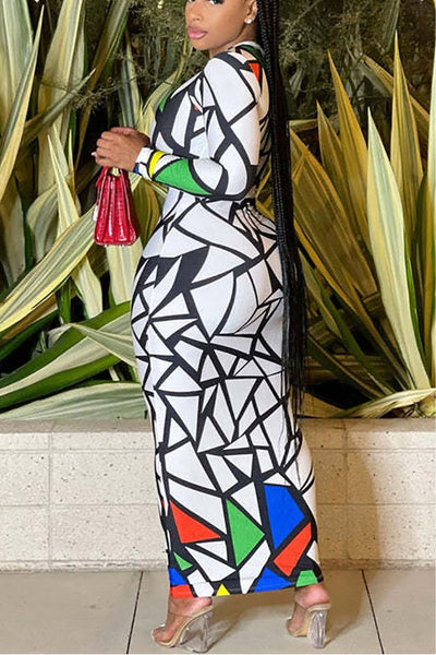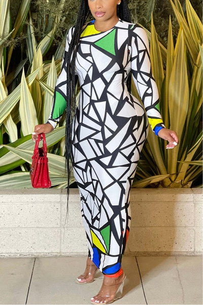 Geometrical Printed, Long Sleeve fitted Maxi dress Silhouette: Regular