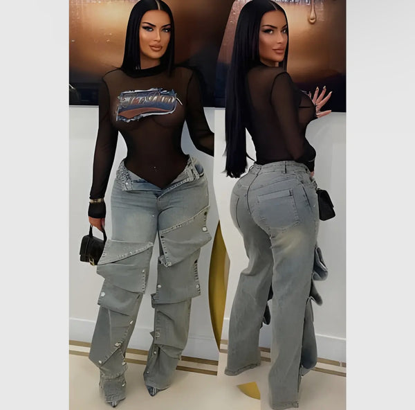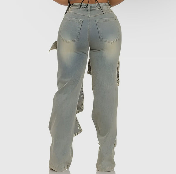 Crafted for those who want to make a statement, our Renegade edge denim jeans combine bold design with utilitarian edge. The high waist and wide leg silhouette create a flattering fit, while cargo-style details add a rebellious touch. With layered, deconstructed panels and snap closures, these pants are perfect for turning heads with confidence and style.