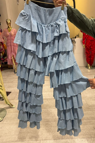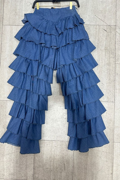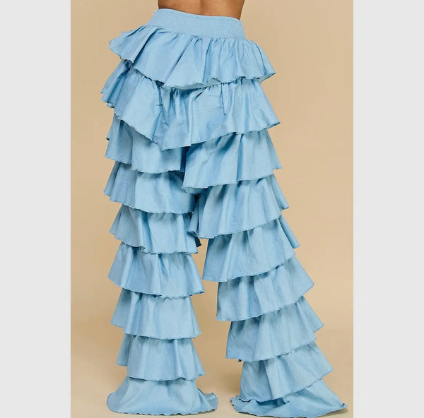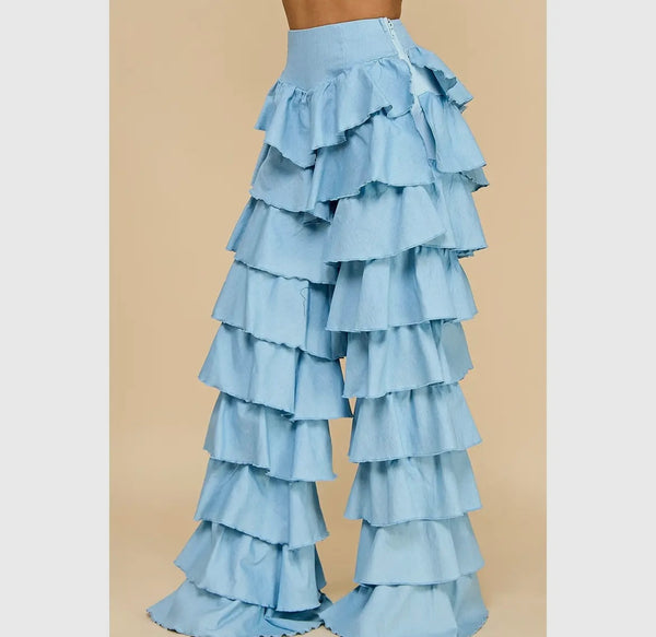 ruffled denim pants, layered jeans, high-waist ruffle pants, side zipper denim, statement denim, plus size boutique pants, fashion-forward jeans, light blue ruffle jeans, medium wash jeans, bold denim looks