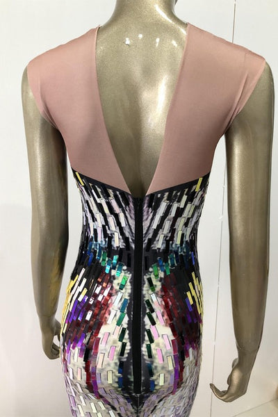 Indulge in pure luxury with our Sequins Butterfly Maxi Dress. Adorned with vibrant, colorful sequins, this dress features a stunning butterfly design and a sophisticated V neck cut. The body print and flowing gown silhouette add elegance, while the mesh underlining on top provides subtle allure. Stand out and make a statement in this one-of-a-kind dress.