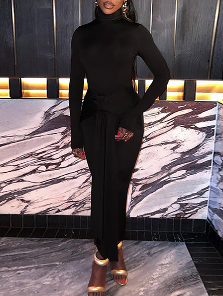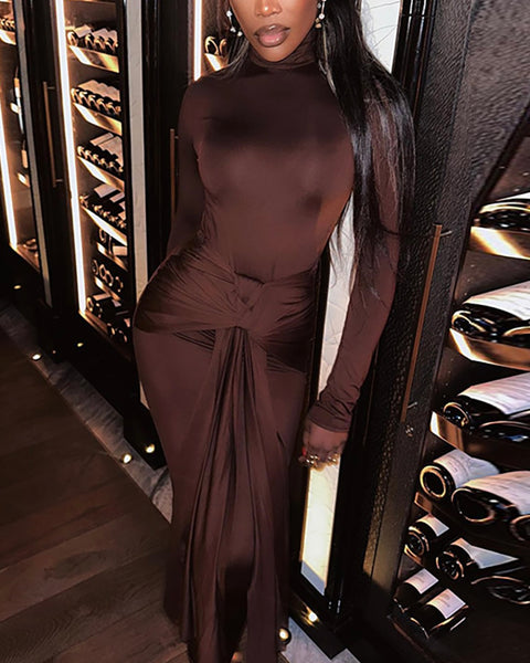 Introducing Streaming Beauty, the ultimate expression of elegance and luxury. This glamorous maxi dress features a stand collar, long sleeves, and a ruched tied up streamer on the waist. Perfect for special occasions and unforgettable moments.