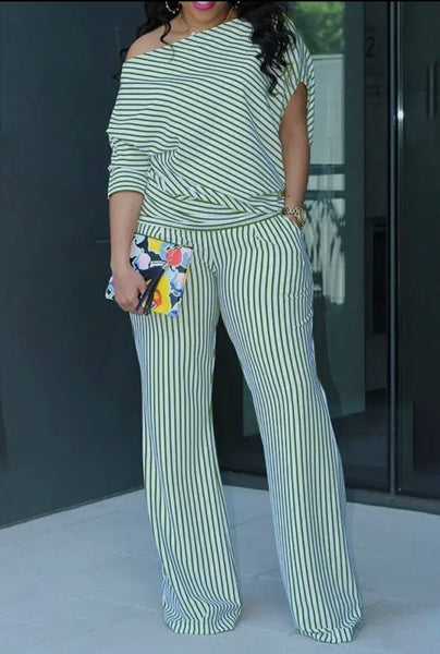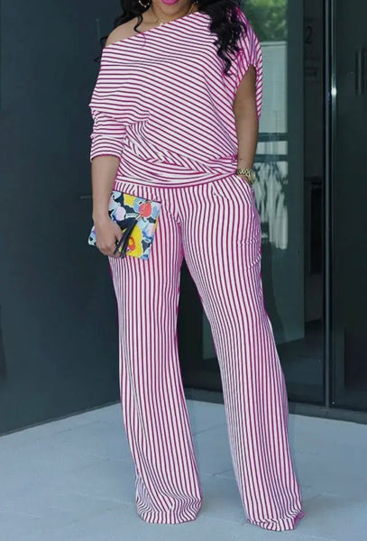 Stylish Striped Casual Asymmetrical Oblique Shoulder Two-Piece Set (S-3X)