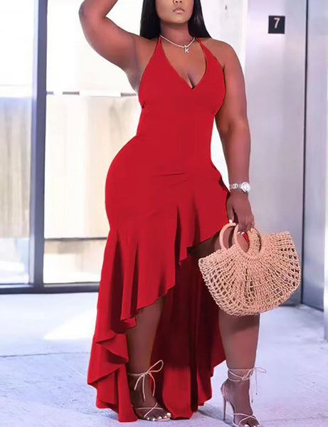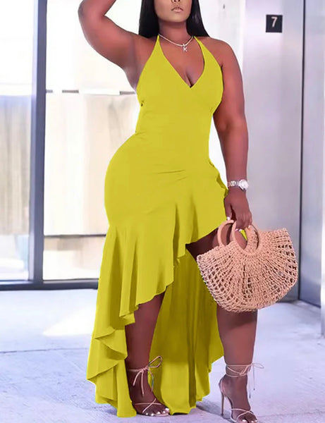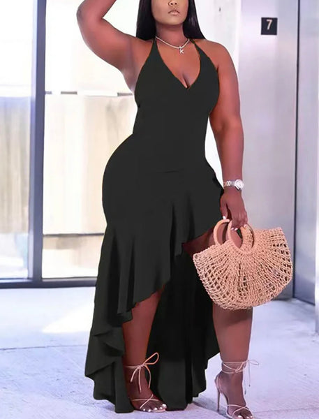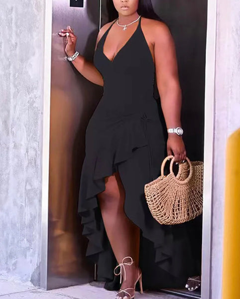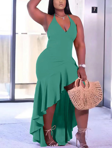 The Cha Cha is a stylish midi dress featuring a V-neck, asymmetrical ruffle hem, and sleeveless design. Crafted with a cami style, it offers a flattering and comfortable fit. Perfect for any occasion, the Cha Cha adds a touch of elegance to your wardrobe.